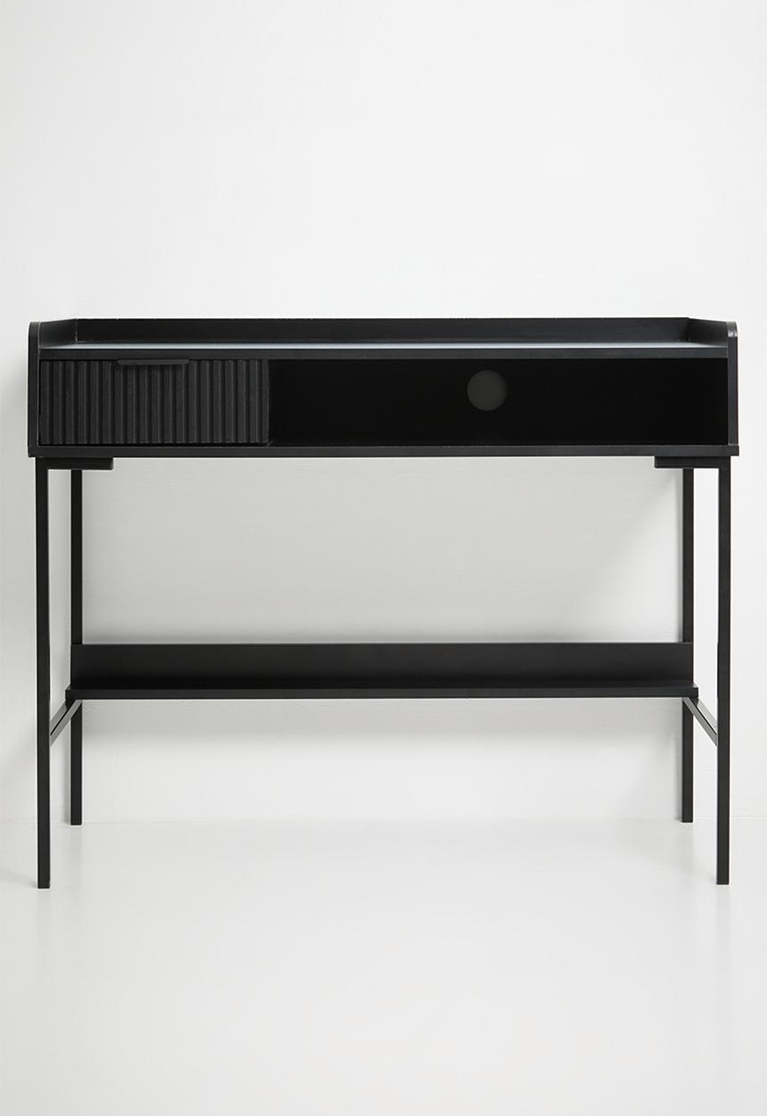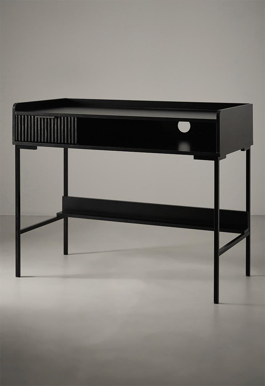A sleek and modern black desk designed for productivity and style. The Optima Desk combines clean lines with practical surface space—perfect for home offices, study areas, or workspaces where function meets contemporary design. Its versatile finish complements a range of décor styles while providing a comfortable and efficient work surface.