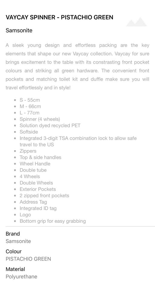 Travel in style with the Vacay Spinner – Pistachio Green – Medium (66cm), your perfect mid-size companion for weekend getaways or short stays. Featuring a lightweight yet durable hard shell, smooth 360° spinner wheels, and a telescopic handle, this bag is built for easy movement and stress-free travel. The fresh pistachio green finish adds a pop of colour to your luggage lineup, while the spacious interior with organised compartments keeps your essentials secure and tidy.
